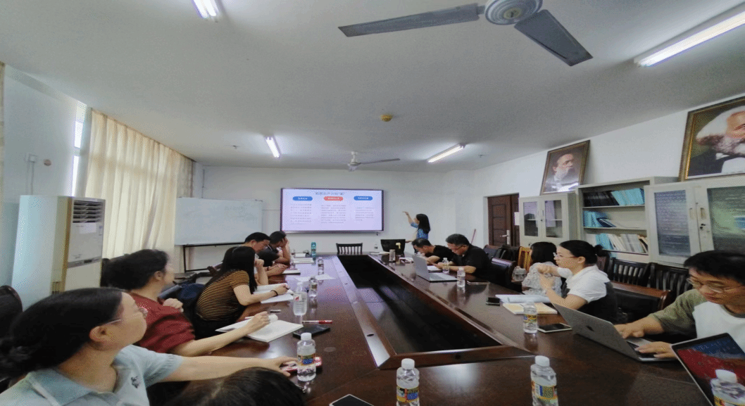 会议第一阶段,主讲人说课。赵静波首先说明第三章课件修改情况和教学重难点问题,并介绍了备课的总体思路以及学时安排。她将第三章划分为三讲,并从社会存在的条件、社会运动的矛盾、社会发展的动力、社会历史的主体和社会发展的规律五个方面介绍如何讲授唯物史观。