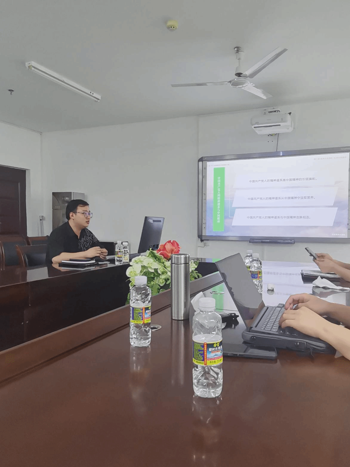 会议第一阶段,主讲人说课。林罗添骥老师介绍了中国精神章节的教学思路、主要内容、教学重难点及在教育部课件基础上做出的修改,并围绕重难点做了详细地讲解。