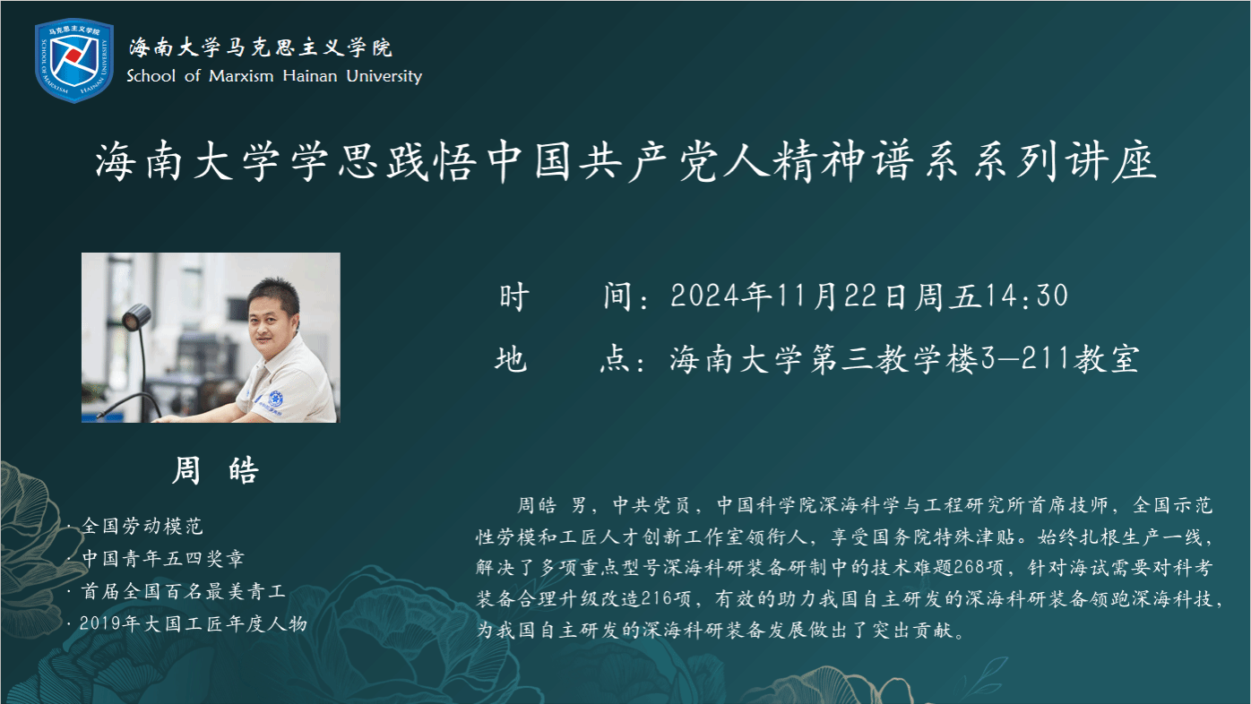 2024年11月22日下午,澳门网投官方网站学思践悟中国共产党人精神谱系系列讲座正式开讲。学院邀请了中国科学院深海科学与工程研究所首席技师、2019年大国工匠年度人物周皓为2024级数学与统计学院本科生做专题讲座。周皓以“践行工匠精神 献身深海科考 新征程 再起航”为题,从成长经历、深海科考、工匠精神三方面为同学展开讲授,由凤翔书院郭孝伟老师主持,澳门网投官方网站蔡文举副院长参加。