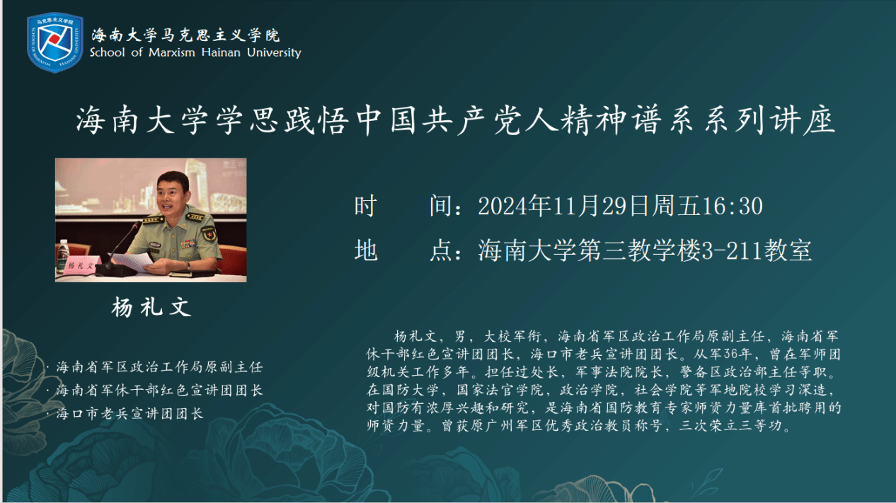 2024年11月29日,澳门网投官方网站邀请海南省军休干部红色宣传讲团团长杨礼文大校作澳门网投官方网站学思践悟中国共产党人精神谱系系列讲座报告。报告以“认识南海,热爱南海,捍卫南海”为主题,从南海的基本情况和复杂成因两个方面展开讲述。报告由凤翔书院郭孝伟老师主持,澳门网投官方网站蔡文举副院长参加。