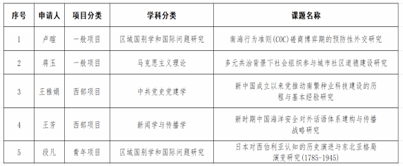 近日,全国哲学社会科学工作办公室公示了2025年国家社会科学基金年度项目立项名单。澳门网投官方网站喜获5项课题立项,其中一般项目2项、西部项目2项、青年项目1项,涉及马克思主义理论、中共党史党建学、区域国别学和国际问题研究、新闻学与传播学四个学科。立项课题信息如下: