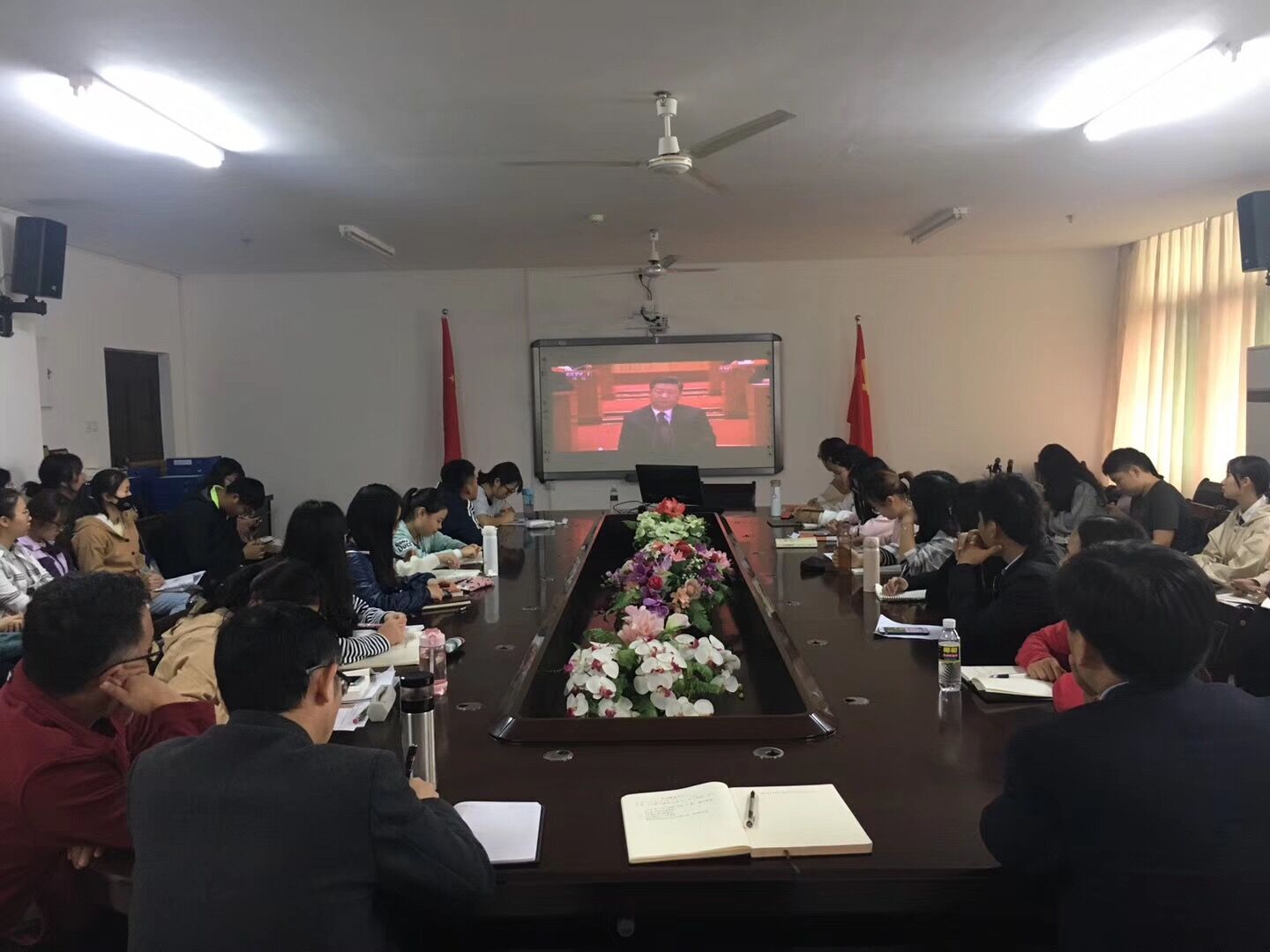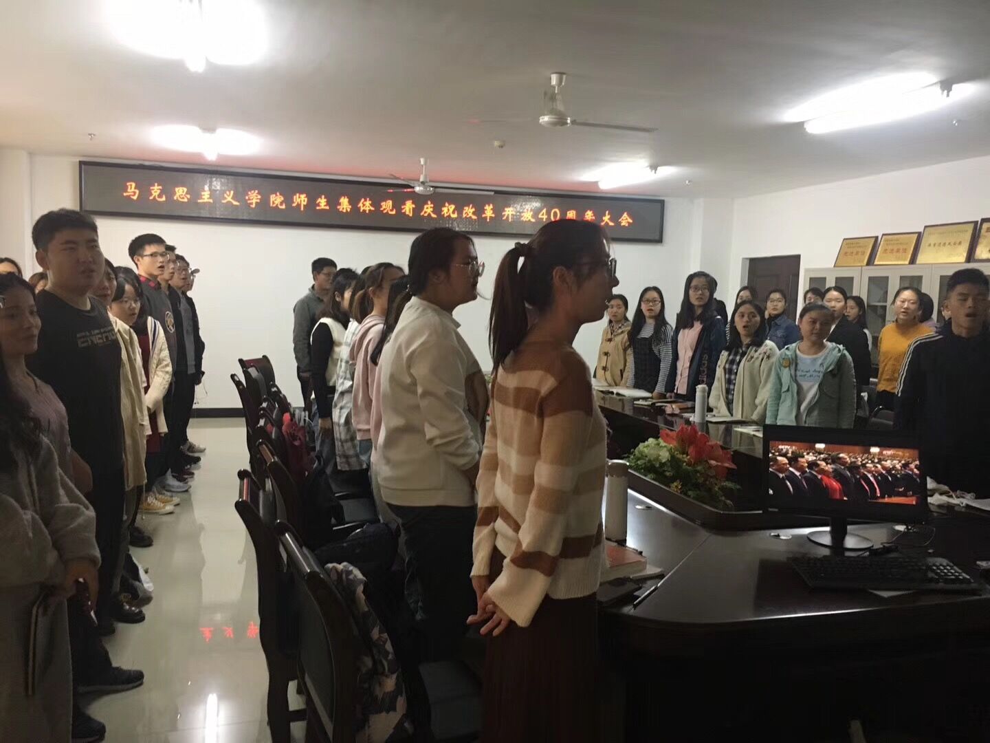 12月18日上午,澳门网投组织师生代表于社科楼A311集中观看“庆祝改革开放40周年大会”直播实况。院领导张井富、吴朝阳,部分教职工和学生共100多人全程观看庆祝大会。