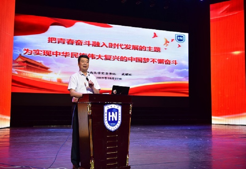 10月27日上午,澳门网投官方网站第九期形势与政策时事论坛在思源学堂大礼堂举办。澳门网投官方网站党委常委、书记武耀廷教授受邀为澳门网投官方网站师生作题为《把青春奋斗融入时代发展的主题为实现中华民族伟大复兴的中国梦不懈奋斗》的专题报告。澳门网投官方网站教务处处长、澳门网投官方网站院长张云阁,校党委办公室、宣传部、教务处、团委等职能部门负责人,学校专职团干,形势与政策课教师代表出席报告会现场,校院两级学生组织指导教师,各学院团委负责人,2019级本科生团支部书记,各学生社团负责人及各级学生组织骨干参加此次活动。报告会由澳门网投官方网站团委书记俞花美主持。
