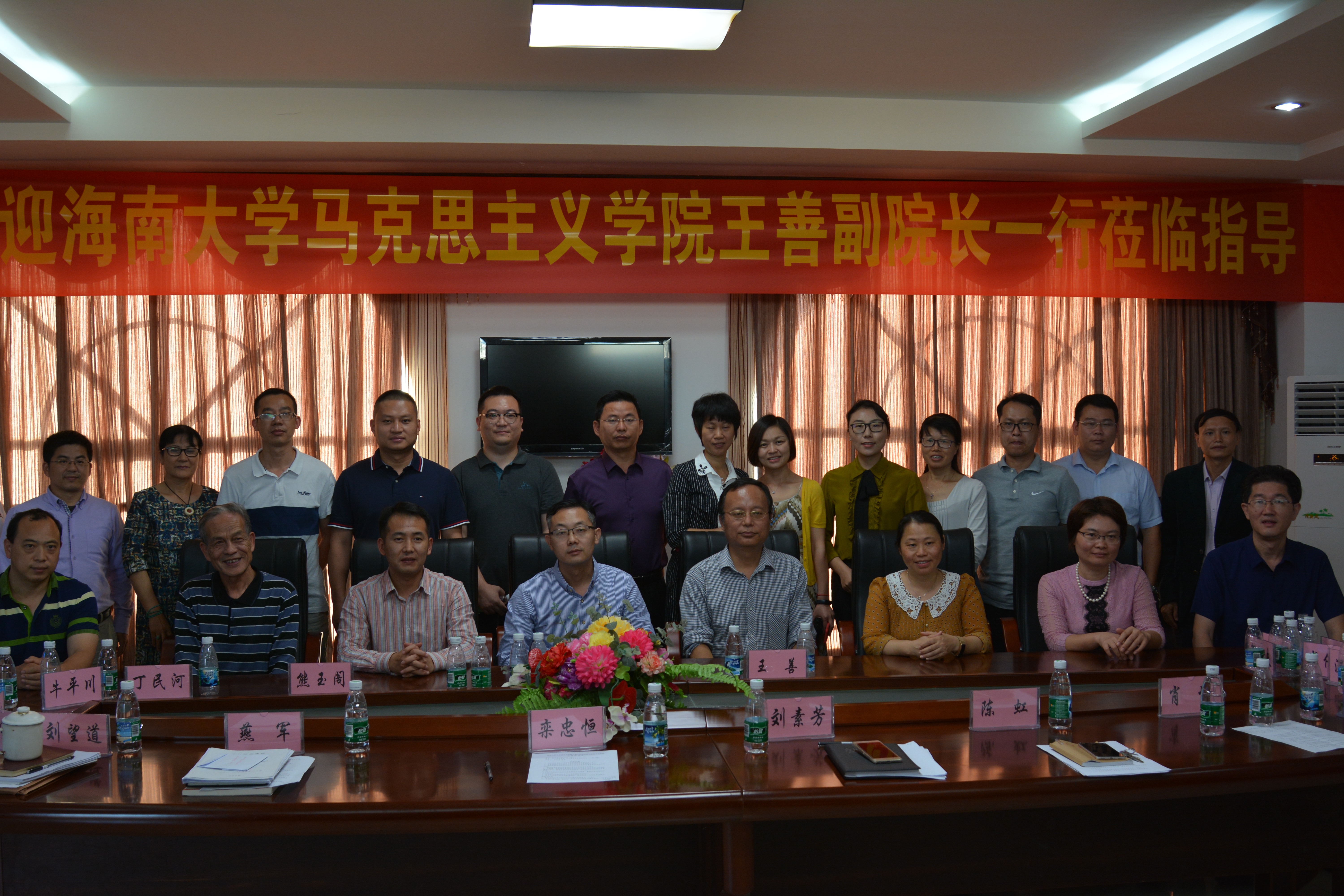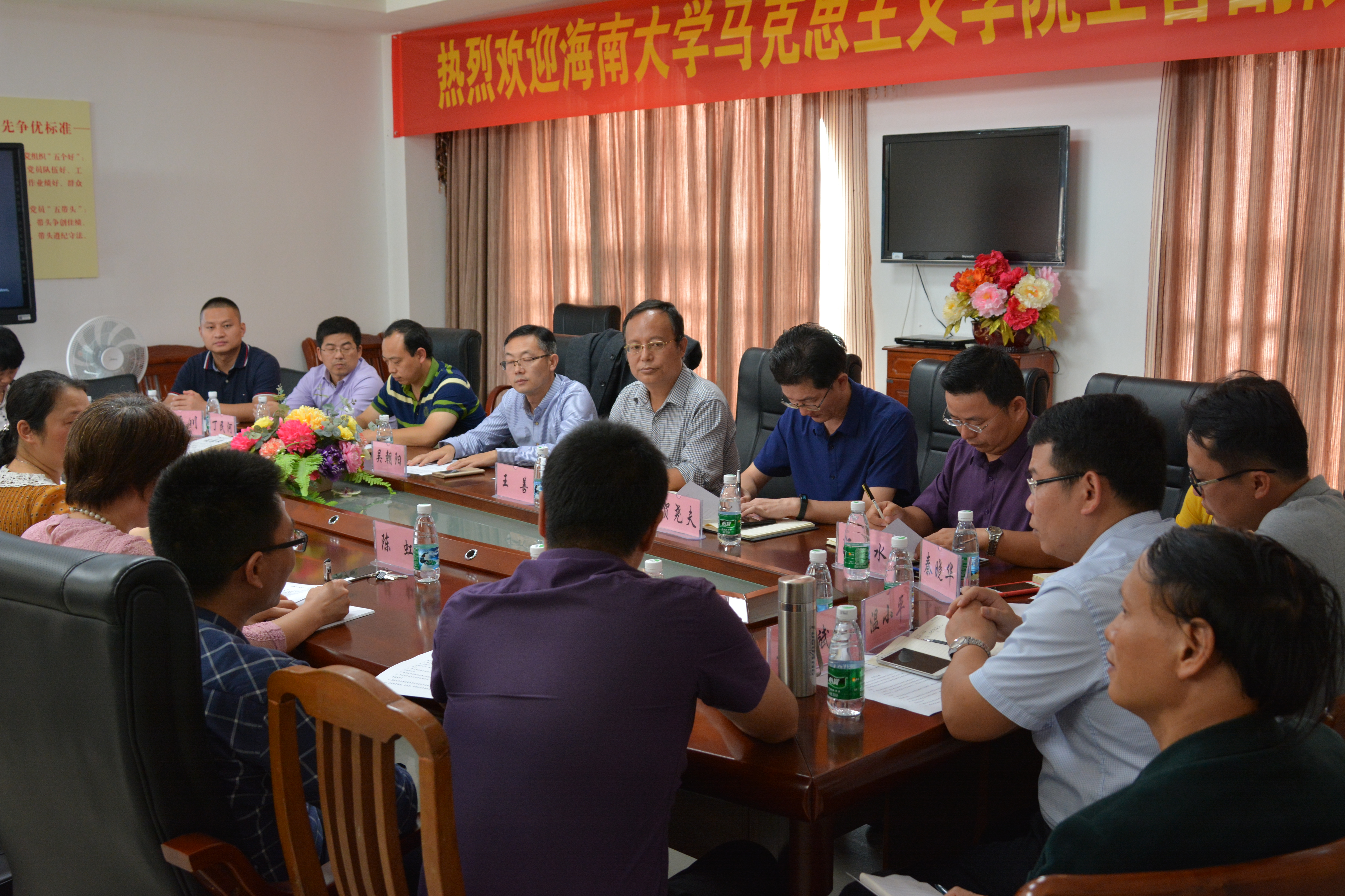 近期,澳门网投官方网站副院长王善、教学委员会副主任贺尧夫带领思想政治理论课五个教研部负责人和部分骨干教师等一行14人赴海口经济学院马克思主义院进行教学交流研讨活动。澳门网投官方网站教务处副处长吴朝阳、教务系统负责人熊玉阁、教务科科长丁民河也一同参加了此次活动。