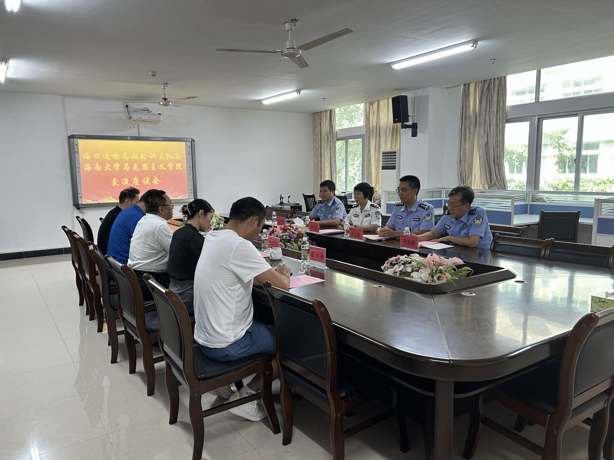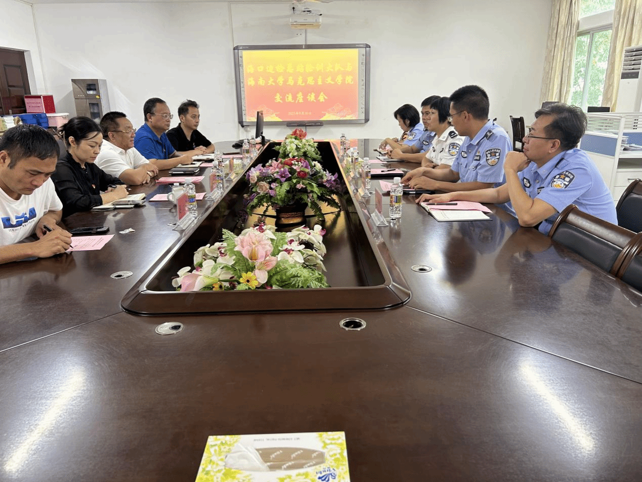 2023年9月20日海口边检总站轮训大队与澳门网投官方网站在社科楼A311会议举行交流座谈会,海口边检总站轮训大队大队长刘瑛、副大队长吴镇波、处长程桂东、教员李海波和陈蕾出席座谈会,澳门网投官方网站部分领导班子成员和科室主任参加会议,会议由学院党委书记段捷频主持。