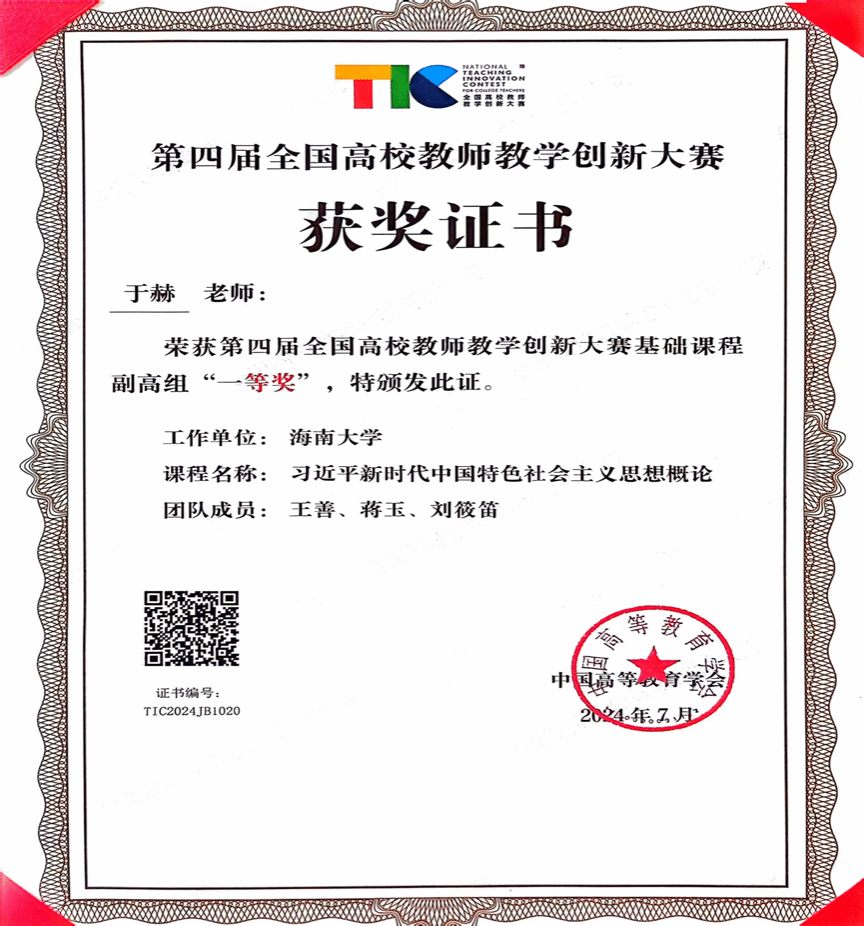 澳门网投于赫老师代表海南省与来自全国多所高校的教师进行了同场竞技,主讲了《习近平新时代中国特色社会主义思想概论》,凭借扎实的教学基本功和良好的综合素养,在竞争中脱颖而出,荣获基础课程副高组一等奖,取得了我校也是海南省在全国高校教师教学创新大赛中的历史性突破,展示了澳门网投思政课教师的专业素养、教学水平和精神风貌。