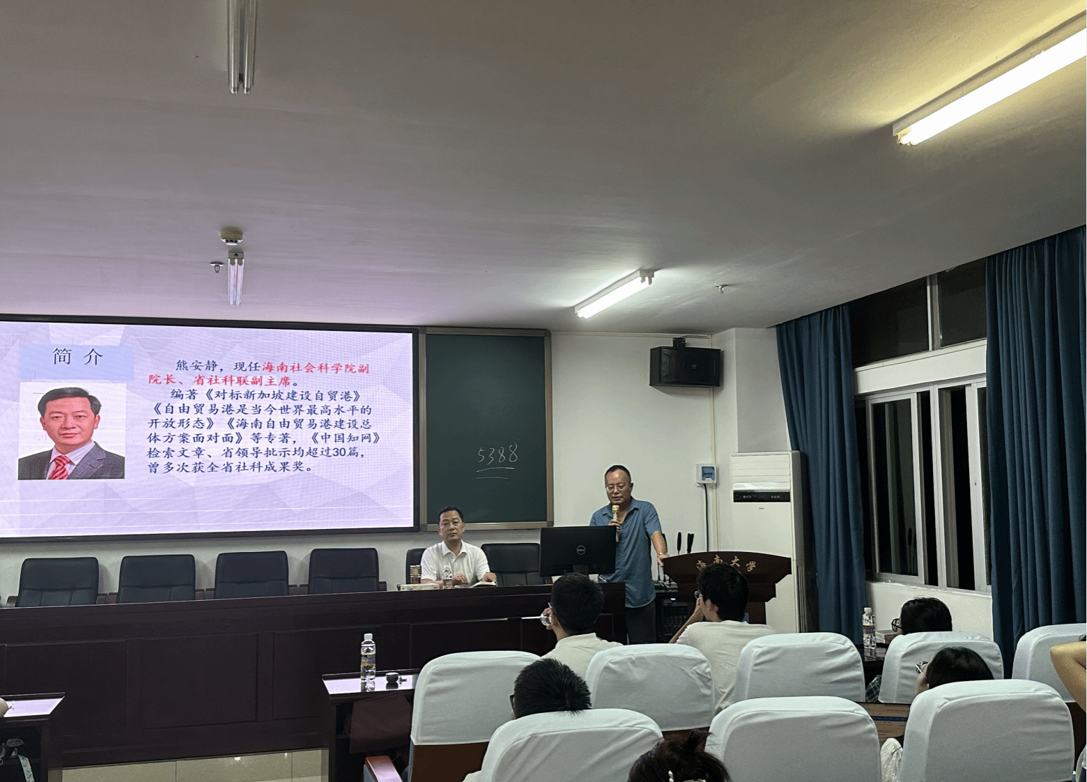 2023年10月23日,澳门网投官方网站“冬季小学期系列课程”第五讲在社科楼A309会议室举⾏。海南社科联副主席熊安静以“海南自由贸易港试点政策进展与封关运作展望”为题,为澳门网投官方网站师生做了一场生动的报告。报告会由王善副院长主持,澳门网投官方网站本科生、研究生以及博士生聆听了此次学术报告。