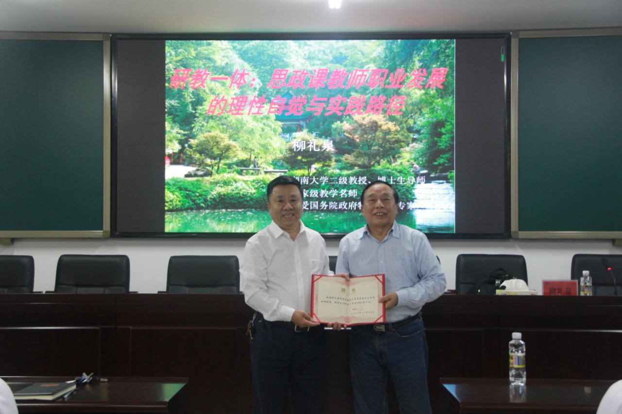 11月19日晚上,湖南大学教授、博士生导师、国家级教学名师柳礼泉在社科楼A309为澳门网投官方网站师生作了关于“研教一体:思政课教师职业发展的理性自觉与实践路径”的学术报告。澳门网投官方网站院长张云阁教授主持报告会,并为柳礼泉教授颁发澳门网投官方网站“特聘教授”证书。