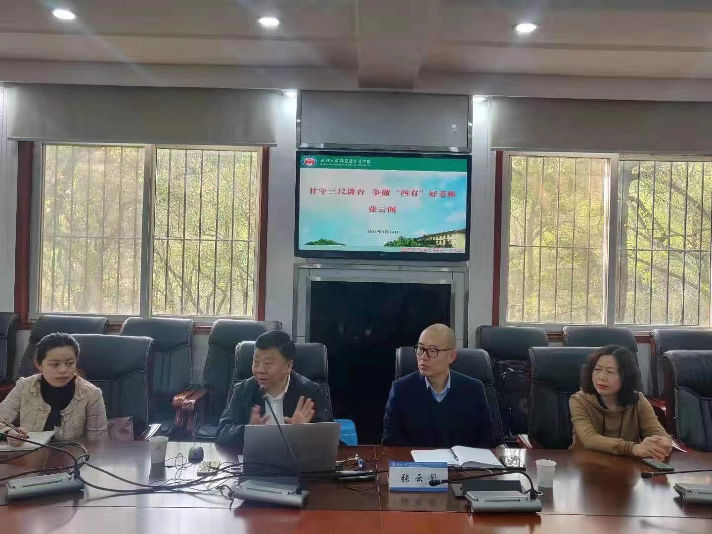 14日上午,应武汉大学澳门网投官方网站的邀请,张云阁教授又为学院师生做了一场:甘守三尺讲台 争做“四有好老师”的师德师风报告。张云阁教授从教书育人是教育的本质要求、好老师是大学的灵魂、好老师必备的条件和实现“四有”好老师的路径四个方面,结合自身的工作经历,报告了自己的理解与体会。张教授的报告内容丰富、案例生动、语言幽默,教育性强,得到了与会师生的高度评价。报告结束后,张教授还回答了师生们提出的问题。