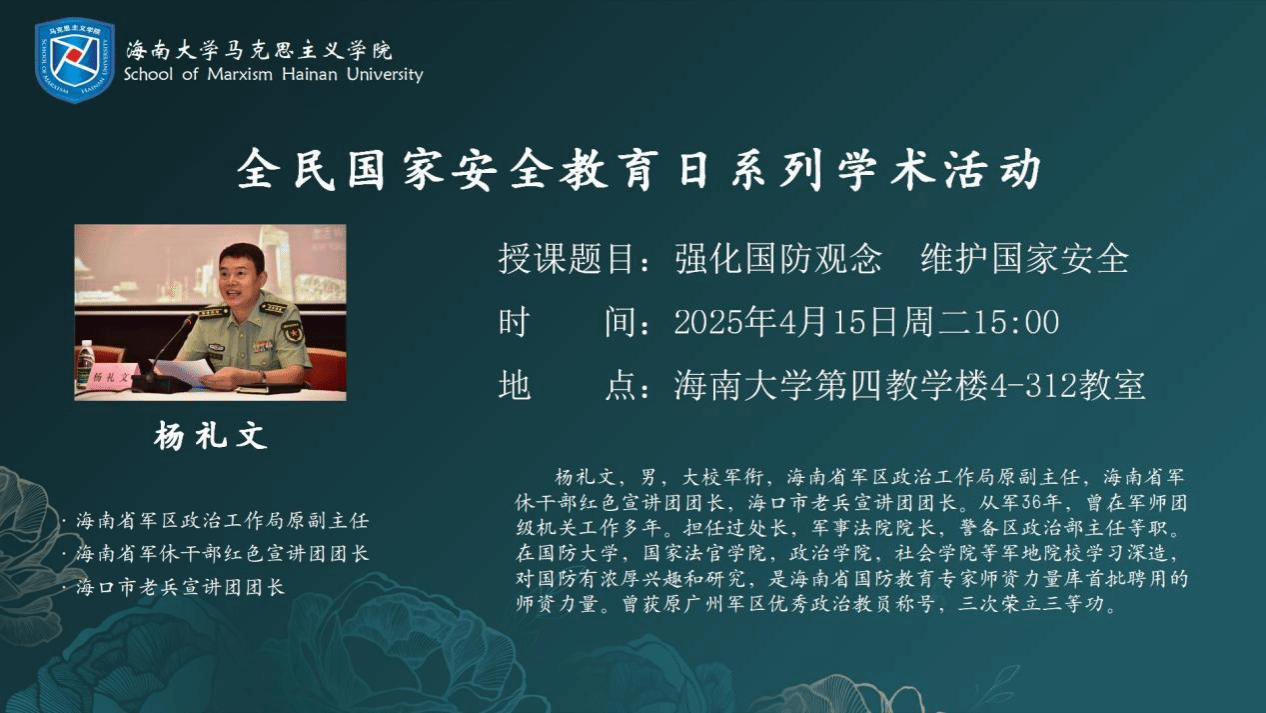 2025年是《中华人民共和国国家安全法》颁布施行10周年,为深入学习贯彻总体国家安全观,提升国家安全意识和素养。2025年4月15日下午,澳门网投官方网站邀请海南省军休干部红色宣传讲团团长杨礼文走进形势与政策课堂,以“强化国防观念,维护国防安全”为主题,从树立国防观念的历史背景和当前国际局势两个方面展开授课。